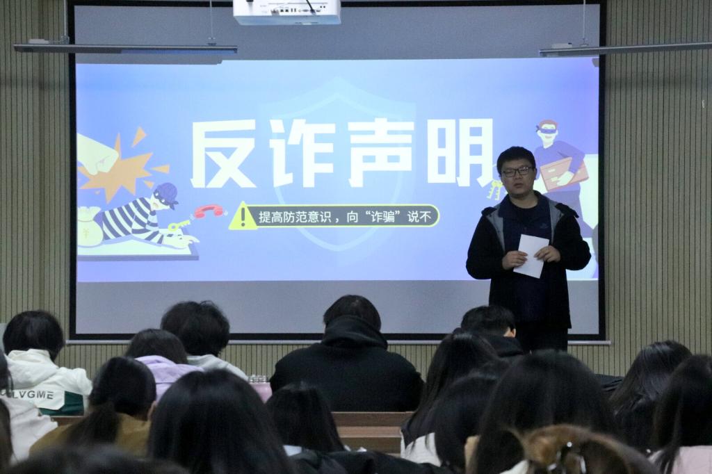 会议伊始,韩传喜结合近期高发的校园诈骗案例,详细讲解网络刷单、冒充客服退款、校园贷、冒充熟人借钱等常见诈骗类型的作案手法。随后,韩传喜通过播放反诈宣传短片、剖析真实案例,同学们直观感受诈骗的危害性;同时重点强调了防范诈骗的核心要点,指导学生牢记“三不一多”原则(未知链接不点击、陌生来电不轻信、个人信息不透露、转账汇款多核实),并现场演示了国家反诈中心APP的下载安装与使用方法,提醒学生遇到可疑情况及时联系辅导员或报警求助。