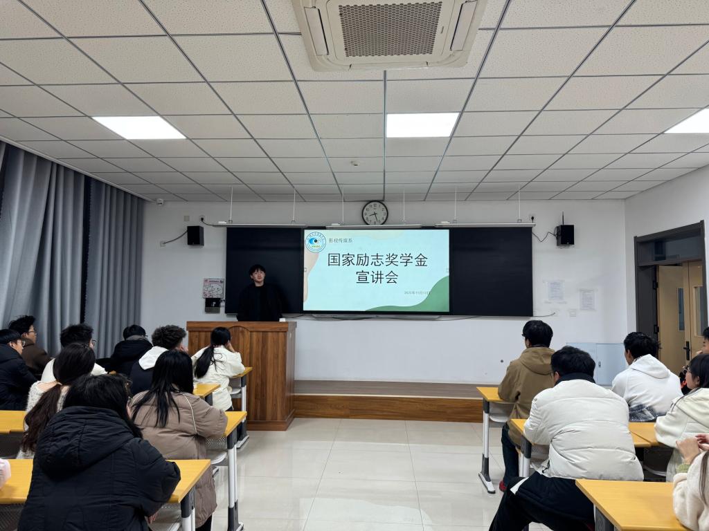 为让同学们了解励志奖学金设立的含义,11月13日,影视传媒系在知行楼a411举行国家励志奖学金宣讲会,2024—2025学年的励志奖学金获得者安文贺同学主讲,25级新生参加。