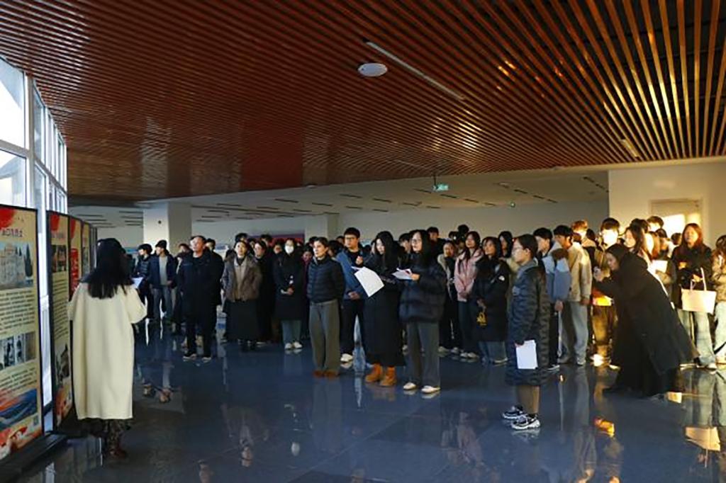 为加强青年学生思想政治引领,传承红色基因,厚植爱国情怀,12月3日下午,影视传媒系组织师生在知行楼四楼连廊参观“烽火齐鲁英雄魂”主题照片展。系党总支书记喻春英、主任王付军、副主任马俊臣及相关教师、学生代表参加活动。