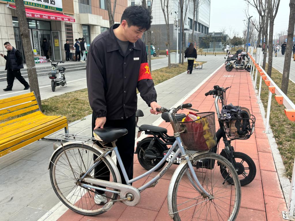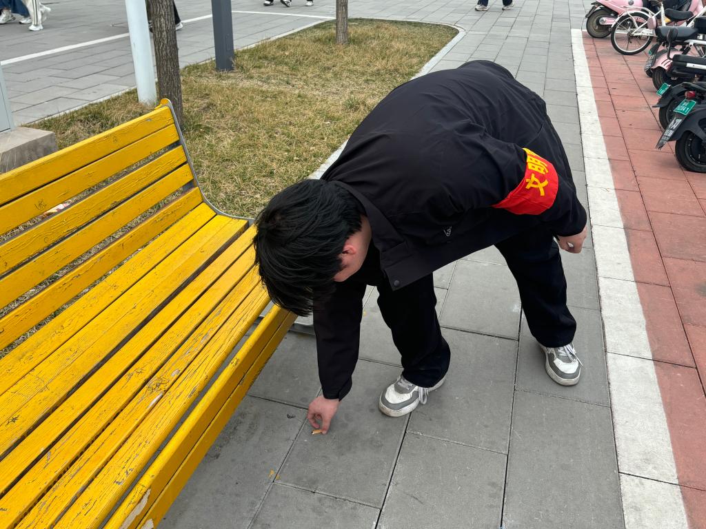 活动现场,志愿者们沿着校园主干道、绿化带、教学楼周边、食堂及宿舍区域细致排查,弯腰捡拾烟头、纸屑、塑料袋等垃圾杂物,不放过卫生死角,以“小行动”守护“大环境”。在共享单车停放区,志愿者们将歪斜、倒地的车辆逐一扶正,按照统一朝向规范摆放,对乱停乱放车辆进行有序归位,让原本杂乱的停放点变得整齐美观,既方便师生出行,也提升了校园整体风貌。